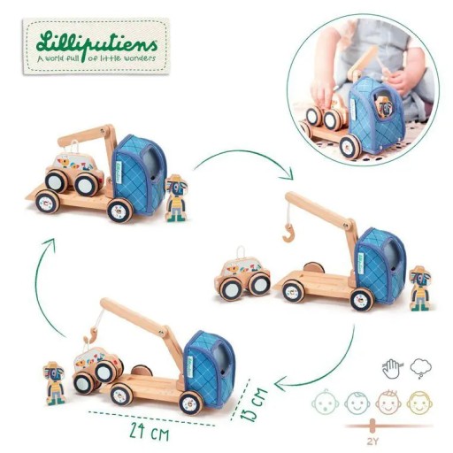 Drewniany holownik z ruchomym hakiem i autkiem Osiołek Ignace 2 lata+ Lilliputiens . Holownik z akcesoriami z kolekcji Osiołek Ignace belgijskiej marki Lilliputiens to niebanalna zabawka na bazie miękkich tkanin i naturalnego drewna, angażująca dziecko na wiele godzin. W skład zestawu wchodzi sporych rozmiarów drewniany holownik z ruchomym hakiem na obracanym wysięgniku oraz miękką, mocowaną na napy, kabiną kierowcy, wykonaną z materiału w kolorze niebieskim w biało – granatową kratkę. Uzupełnieniem zestawu jest drewniany samochód osobowy z namalowanymi ptasimi pasażerami i sznureczkiem - uchwytem na dachu oraz drewniana figurka Osiołka Ignace'a – wszystko w poręcznych dla maluszka rozmiarach, które umożliwiają swobodne manipulowanie: wkładanie i wyciąganie osiołka z pojazdu, chwytanie i wciąganie autka na lawetę itp. Kółka pojazdów wykończone są gumą, dzięki czemu nie rysują podłogi w domu. Zabawka jest solidnie wykonana i bezpieczna. Pobudza dziecięcą wyobraźnię, zachęca do snucia opowieści, odgrywania ról i odtwarzania sytuacji, związanych z podróżowaniem samochodem. Rozwija małą motorykę (chwytanie, przesuwanie, wkładanie, wyjmowanie, łączenie, odpinanie, zapinanie), aktywizuje zmysł wzroku i dotyku, zapoznaje z zadaniami pomocy drogowej.