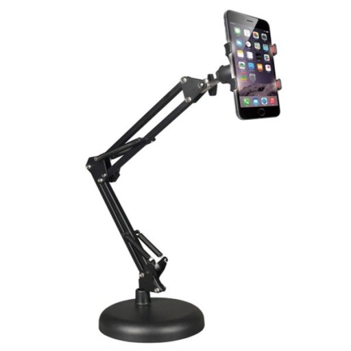 Statyw z podstawą okrągłą która pozwala na stabilne utrzymanie telefonu na stole.