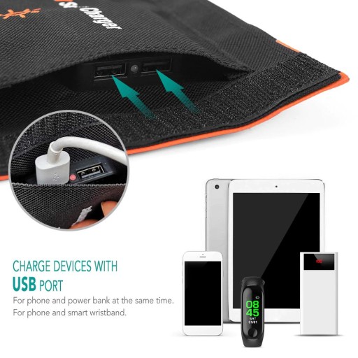 Use the sun's energy to charge your devices! With this powerful solar powered charger that is portable and foldable, you can quickly charge your devices. Just hang it on your backpack and the polycrystalline silicon panel will effectively convert solar power into electrical energy, so you can charge your phone, tablet and other devices with USB port (5V) during camping, backpacking and hiking, which is environmentally friendly and convenient . Waterproof and has 2 USB ports! Features: FAST CHARGING: 21W solar panel with more than 18.5% conversion efficiency and output peak current is 3500mAh in total for dual USB ports. SMART TECHNOLOGY: Built-in intelligence chip that can identify different devices and change the input current according to your device. COMPATIBLE: For almost devices like phone, tablet and other devices with USB ports. WATERPROOF: PET polymer surface and outer PVC cover can protect the solar panel from unexpected rain or fog, just don't put it in water. PORTABLE: Hang it on your backpack and make full use of solar energy to charge during travel, and fold it to fit in your backpack for convenient transportation.Specification: Material: PET solar panel + PVC Conversion efficiency: ± 18.5% Power: 21W Output voltage: 5V±0.2V Output current: 3500mA (peak current) Output port: Dual USB Unfolding size: 65 * 29 cm / 25.5 * 11.4 inches Folding size: 29 * 17 cm / 11.4 * 6.6 inches Weight: 697 grams / 1.5 lbs Package weight: 806 grams / 1.7 lbsPackage list: 1 * Sun Power Charger Panel