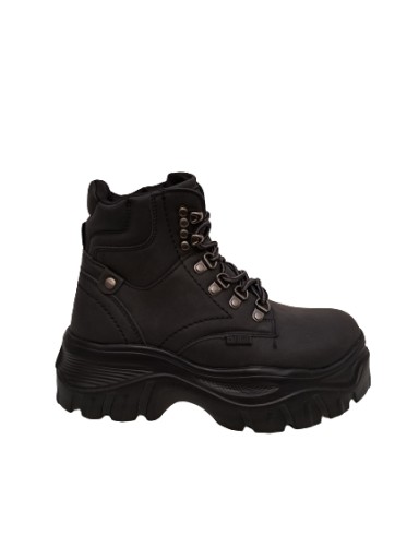 Botki — trapery firmy Big Star wykonane z eko skóry. Posiadają wkładkę Memory Foam System, która zapamiętuje kształt stopy, zapewnia doskonałe dopasowanie, absorbuje wstrząsy, jest odporna na odkształcenia oraz pozwala na odparowanie wilgoci i regulację temperatury. Masywna podeszwa o grubości 5,5 cm oraz płaski obcas sprawiają, że botki są stabilne. Model ze sznurowaniem.