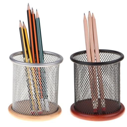 Pojemnik na długopisy z siatki na podstawie drewnianej to elegancki i funkcjonalny element biurowy.
