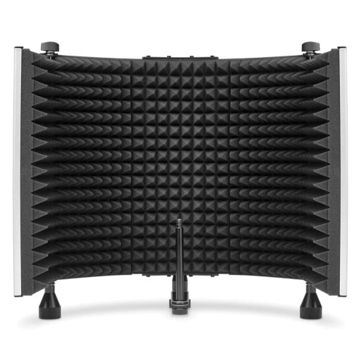 Przenośna kabina antyrefleksyjna do nagrywania wokalu, redukuje hałas otoczenia, 5 perforowanych metalowych paneli o wysokiej jakości [3 stacjonarne, 2 składane], mocowanie na stole lub do statywu mikrofonowego, profesjonalna pianka wygłuszająca EVA