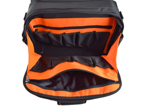 Pojemna komora główna została podzielona na dwie mniejsze z niezależnym zamknięciem każdej. W torbie zmieszczą się wszystkie najpotrzebniejsze narzędzia. Dzięki możliwości pełnego otwarcia zyskujemy dostęp do wszystkich narzędzi.