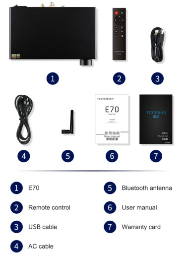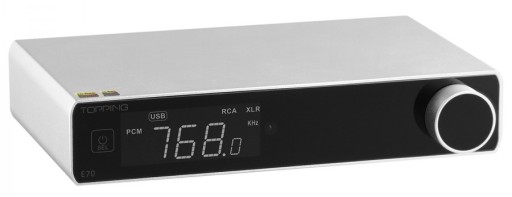 Topping E70 to potężny przetwornik cyfrowo-analogowy. Model oferuje bogatą i precyzyjną reprodukcję dźwięku w połączeniu z inteligentnymi i praktycznymi funkcjami, takimi jak Bluetooth, wyzwalacz 12V czy regulowany poziom wyjściowy.