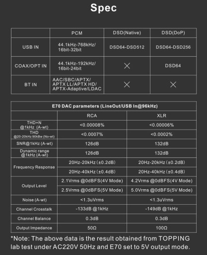 Wejście USB Topping E70 jest powiązane z najnowszą generacją interfejsu XMOS XU316, z niestandardowym sterownikiem Thesycon. Ten potężny interfejs obsługuje strumienie audio o wysokiej rozdzielczości, do PCM 32bit 768kHz i DSD512, zapewniając bardzo wysoką jakość odsłuchu.
