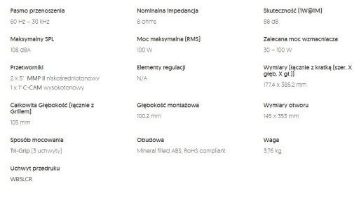 Głośnik Monitor Audio WT150-LCR wyposażono w 5 calowe basowe przetworniki MMP II umieszczone po obu stronach kopułki wysokotonowej C-CAM.
