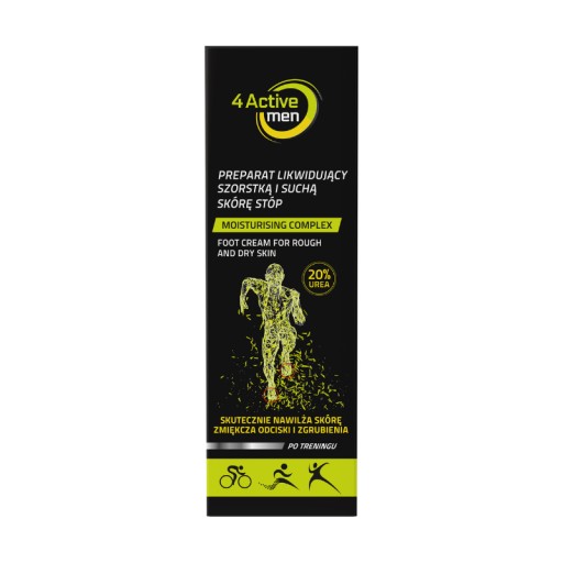 Skóra sportowców bardzo często narażona jest na brak nawilżenia, suchość pięt, odciski czy nagniotki powstałe w wyniku nadmiernego obciążenia stóp podczas uprawiania różnych dyscyplin sportowych. Krem 4Active Men zawiera 20% UREA. Skutecznie regeneruje, zmiękcza i uelastycznia skórę. Regularnie stosowany likwiduje suchość pięt i nawilża skórę stóp.