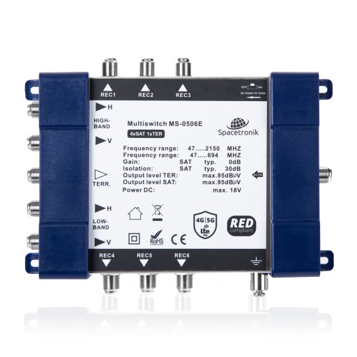 Nowy multiswitch Spacetronik E-Series MS-0506E do dystrybucji sygnału z jednej satelity oraz telewizji naziemnej dla 6 odbiorców. W zestawie zasilacz