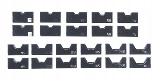 Do zaciskarki dołączony jest komplet 11 matryc w rozmiarach:16, 25, 35, 50, 70, 95, 120, 150, 185, 240 oraz 300mm²