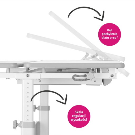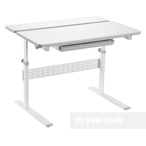 Nowe ergonomiczne biurko FunDesk Colore o zwiększonej powierzchni roboczej stworzone z myślą o zapewnieniu bardziej przyjaznych i komfortowych warunków do nauki. Wysokość biurka może być regulowana w zależności od wzrostu dziecka. Blat można pochylić bez żadnego wysiłku do 40˚ i wykorzystywać do malowania, pisania i czytania. Szuflada znajdująca się pod blatem ma dużo miejsca na książki i przybory piśmiennicze.