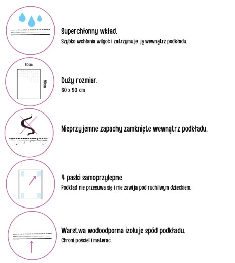 Jednocześnie powłoka ta pozwala na skuteczne odprowadzenie wilgoci oraz neutralizowanie nieprzyjemnych zapachów. Podkłady Bocioland dają uczucie suchości i komfortu, sprawdzą się nie tylko w domu, ale także w podróży.