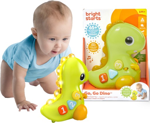 Zabawka interaktywna Dino świeci, gra i porusza się na kółkach, zachęcając dziecko do ruchu i raczkowania. Kiedy dziecko dorwie się do tej zabawki, może odkrywać liczby, kolory i kształty za pomocą łatwych do naciśnięcia przycisków. Stukanie w nosek aktywuje muzykę, światła, ruch i zabawne dźwięki.