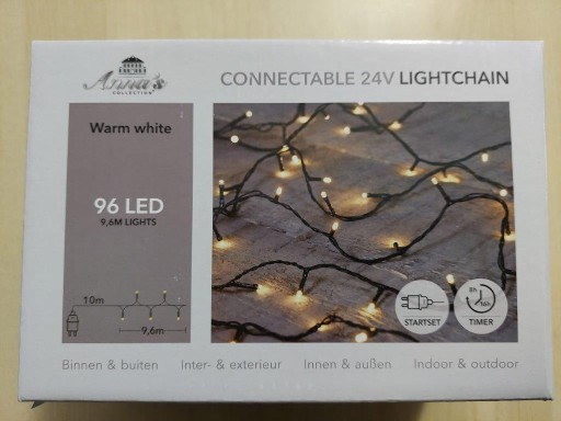 Set startowy łańcuch świetlny, 96 LED/ 9,6 metrów holenderskiej marki Coen Bakker. Kabel jest koloru czarnego, a światełka mają ciepła białą barwę. Łączy się z produktem 228303E. Maksymalnie można podłączyć 9 takich łańcuchów uzyskując 96 m, czyli 960 światełek. Odstęp miedzy ledami to 10 cm. (Zawiera transformator) Łańcuch świetnie się sprawdza do dekorowania wnętrz jak i zewnętrznej części domu. Posiada funkcje Timer (6/18h). Produkt zawiera certyfikat oraz oznaczenie CE zgodne z wymogami Unii Europejskiej. Seria CONNECTABLE 24V LIGHTCHAIN