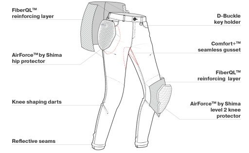 Maksymalna ochrona, duża przewiewność i klasyczny krój. Połączenie tych cech w jeansach motocyklowych DEVON zapewni Ci to, czego potrzebujesz do jazdy na Twoich dwóch kółkach. Obecność wewnętrznej warstwy wzmacniającej wykonanej z FiberQL™ gwarantuje wysoką odporność na przetarcia oraz przyjemne uczucie lekkiego chłodzenia. Dzięki niej oraz przewiewnym protektorom AirForce™ by SHIMA (kolana lvl 2, biodra lvl 1) będziesz czuć się naprawdę bezpiecznie. Protektory kolan posiadają 2-stopniową regulację wysokości i ładowane są od środka. Dodatkowo możesz doposażyć się w protektor kości ogonowej SAS-TEC (sprzedawany oddzielnie). Jeansy motocyklowe DEVON posiadają zaszewki modelujące kolano oraz specjalnie zaprojektowany, bezszwowy klin Comfort+™ w kroku. Odblaskowe przeszycia na dole nogawki (widoczne po jej podwinięciu) dbają o to, abyś został dostrzeżony na drodze nawet po zmroku. Pętelka łącząca pozwala sparować je z kurtką motocyklową, a w funkcjonalnych kieszeniach możesz przechować dokumenty lub drobne na kawę. Model DEVON dostępny jest w 3 wersjach kolorystycznych.