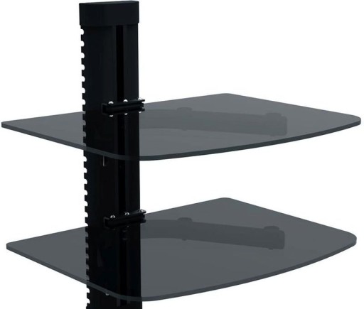 Uchwyt z dwiema półkami z hartowanego szkła o grubości 5 mm do montażu na ścianie, przeznaczona do umieszczenia na niej różnych urządzeń, takich jak tuner SAT, tuner DVB-T, nagrywarka lub odtwarzacz DVD itp.