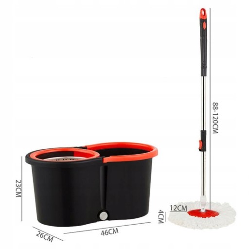 Nasz mop obrotowy został zaprojektowany z myślą o maksymalnej funkcjonalności i wygodzie użytkowania. Dzięki dwukomorowemu wiaderku o wymiarach 46 cm długości, 26 cm szerokości i 23 cm wysokości, możesz w łatwy sposób oddzielić czystą wodę od tej brudnej. To innowacyjne rozwiązanie zapewnia, że zawsze będziesz sprzątać efektywnie, bez konieczności ręcznego wyciskania mopa.
