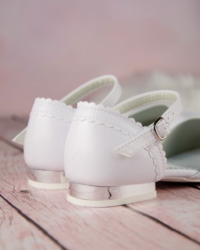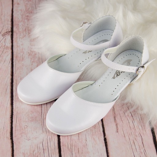 Klasyczne, białe buty komunijne dla dziewczynki, zapinane na regulowany paseczek ze sprzączką. Buciki dobrze wyprofilowane, dzięki czemu pewnie trzymają się stopy. Model na delikatnym obcasiku o wysokości 1,5 cm, w kolorze srebrnym. Eleganckie i gładkie buty będą pasować do każdej sukieneczki. Zewnętrzna część obuwia wykonana jest ze skóry ekologicznej, natomiast zapiętek i wkładka ze skóry naturalnej.