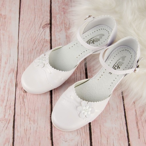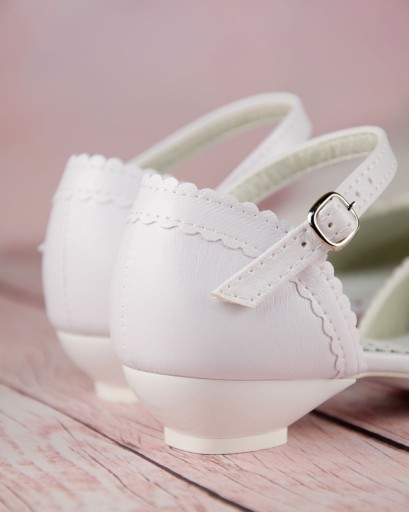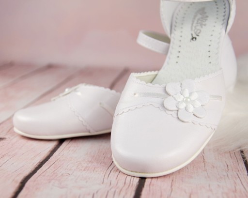 Klasyczne, białe buty komunijne dla dziewczynki, zapinane na regulowany paseczek ze sprzączką. Buciki dobrze wyprofilowane, dzięki czemu pewnie trzymają się stopy. Model na delikatnym obcasiku o wysokości 2,5 cm, w kolorze białym. Uroku dodaje im piękna, kwiatowa aplikacja z przodu cholewki. Zewnętrzna część obuwia wykonana jest ze skóry ekologicznej, natomiast zapiętek i wkładka ze skóry naturalnej.
