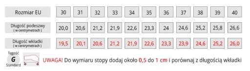 Przy wyborze rozmiaru obuwia prosimy sugerować się długością wkładki. Do wymiaru stopy dodaj około 0,5 do 1 cm i porównaj z długością wkładki.