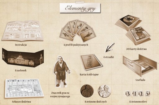 W zestawie znajduje się 6 profili podejrzanych, 243 karty śledztwa, 8 zasłonek, karta Ściśle tajne, 4 strzałki, szuflada, arkusze śledztwa, znacznik gracza rozpoczynającego, 8 żetonów śledczych, 12 żetonów ofert oraz dokumentacja.