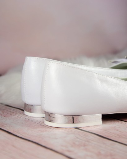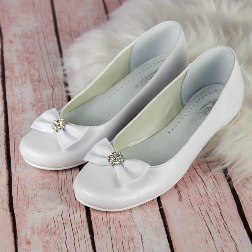 Eleganckie, wsuwane białe buty komunijne dla dziewczynki. Buciki dobrze wyprofilowane, dzięki czemu pewnie trzymają się stopy. Model na delikatnym obcasiku o wysokości 1,5 cm, w kolorze srebrnym. Uroku dodaje im piękna kokarda ze srebrną ozdobą. Zewnętrzna część obuwia wykonana jest ze skóry ekologicznej, natomiast wkładka ze skóry naturalnej. Klasyczne baleriny idealnie sprawdzą się zarówno w dniu Pierwszej Komunii Świętej jak i w podczas innych uroczystości i nie tylko.
