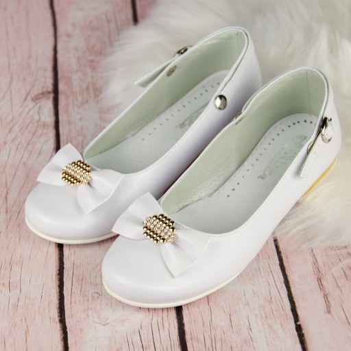 Eleganckie, wsuwane białe buty komunijne dla dziewczynki. Buciki dobrze wyprofilowane, dzięki czemu pewnie trzymają się stopy. Dodatkowo posiadają paseczek, którego można użyć z przodu dla lepszego utrzymania stopy lub z tyłu jako ozdobę. Model na delikatnym obcasiku o wysokości 1,5 cm, w kolorze złotym. Uroku dodaje im piękna kokarda ze złotą ozdobą, zdobioną cyrkoniami. Zewnętrzna część obuwia wykonana jest ze skóry ekologicznej, natomiast wkładka ze skóry naturalnej. Klasyczne baleriny idealnie sprawdzą się zarówno w dniu Pierwszej Komunii Świętej jak i w podczas innych uroczystości i nie tylko.