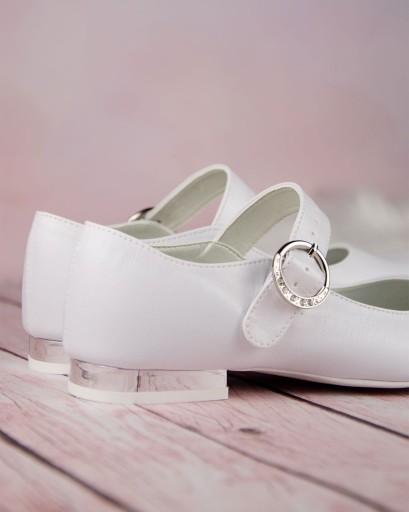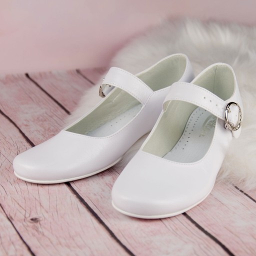 Eleganckie białe buty komunijne dla dziewczynki. Buciki dobrze wyprofilowane, dzięki czemu są bardzo wygodne. Dodatkowo posiadają paseczek z przodu dla lepszego utrzymania stopy. Model na delikatnym obcasiku o wysokości 1,5 cm, w kolorze srebrnym. Uroku dodaje im ozdobną sprzączka. Zewnętrzna część obuwia wykonana jest ze skóry ekologicznej, natomiast wkładka ze skóry naturalnej. Klasyczne baleriny idealnie sprawdzą się zarówno w dniu Pierwszej Komunii Świętej jak i w podczas innych uroczystości i nie tylko.