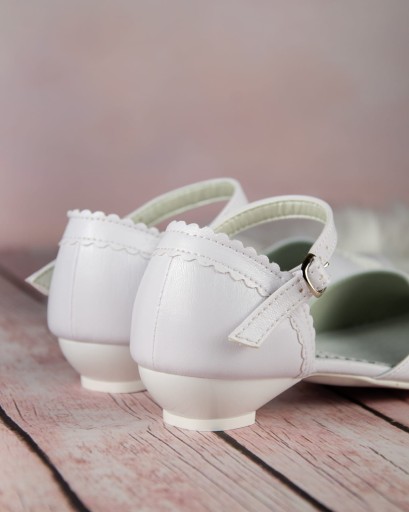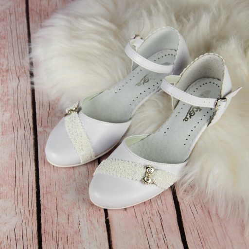 Eleganckie białe buty komunijne dla dziewczynki. Fason z zapiętkiem i regulowanym paseczkiem. Buciki dobrze wyprofilowane, dzięki czemu są bardzo wygodne. Model na delikatnym obcasiku o wysokości 2,5 cm, w kolorze białym. Uroku dodają mu wstawka przyozdobiona malutkimi koralikami, ze srebrną ozdobą. Klasyczny model, który będzie pasował do większości sukienek lub alb. Zewnętrzna część obuwia wykonana jest ze skóry ekologicznej, natomiast zapiętek i wkładka ze skóry naturalnej.