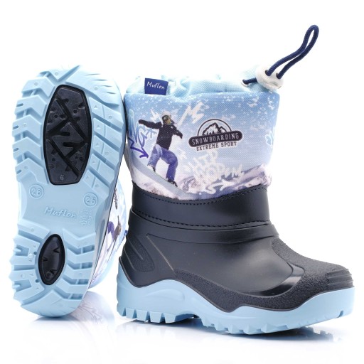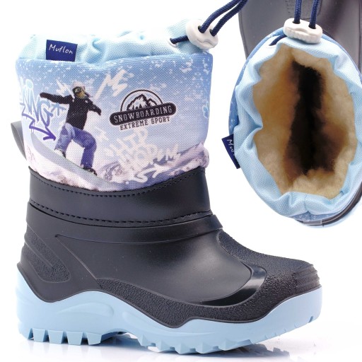 Bardzo ciepłe śniegowce dla dzieci, polskiej firmy MUFLON. Wykonane są z wysokiej jakości materiałów. Górna część cholewki zrobiona jest z ortalionu (zaimpregnowany materiał tekstylny), odporny na przemoczenie ze ściąganym kołnierzem zabezpieczającym przed dostawaniem się wody i śniegu do środka. Buty są ocieplone od wewnątrz naturalną 100 % wełną. Posiadają ocieploną wkładką z folii aluminiowej perforowanej, otoczonej od góry i dołu włókniną, dzięki czemu zachowuje doskonałe właściwości termoizolacyjne.