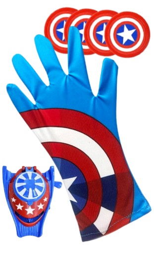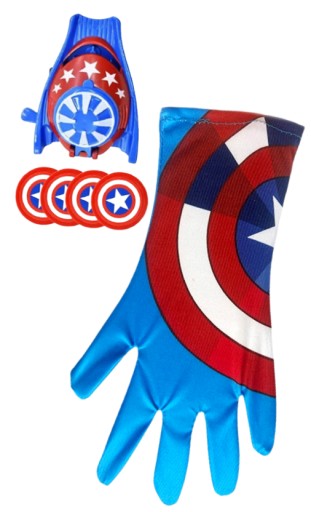 Zestaw KAPITANA RĘKAWICA WYRZUTNIA PELERYNA MASKA ORAZ TARCZA to świetny do przebrania dla chłopców, fanów tego bohatera.