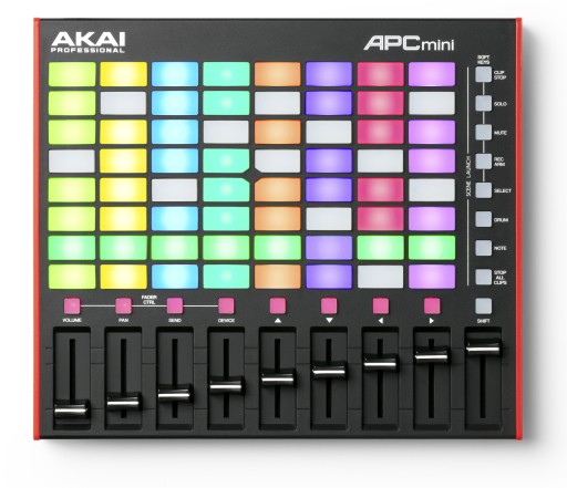 APC Mini jest wyposażony w 64 nowe pady z podświetleniem RGB, służące w sposób doskonały i precyzyjny do reprezentowania klipów w sesji Ableton Live. Czy to w studiu, czy na scenie, przewijana matryca padów z obsługą RGB zawsze błyszczy jasno i odważnie. W chwilach największych nawet twórczych uniesień i najbardziej intensywnych momentów, będziesz bez wahania i w sposób pewny uruchamiać i aktywować pętle, instrumenty, wokale i wiele innych funkcji.