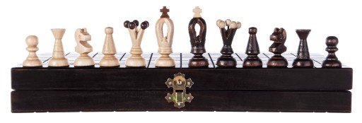 Rozłożona szachownica ma wymiary 35x35x2,5 cm, po złożeniu stanowi pudełko, w którym można przechowywać figury.