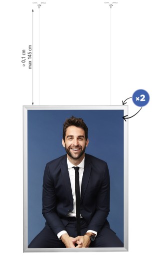 Doskonałe rozwiązanie dla sklepów wielkopowierzchniowych i centrów handlowych. Podwieszana ramka typu Premium, pozwoli na prezentację grafiki obustronnie. System „clip-clap” to błyskawiczna i bezproblemowa wymiana plakatu, która zabiera kilka sekund. Mocna, stalowa linka gwarantuje bezpieczne i stabilne podwieszenie ramki. W zestawie znajdują się uchwyty do montażu ramki na suficie.