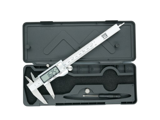 Suwmiarka elektroniczna (w metalowej obudowie wyświetlacza).