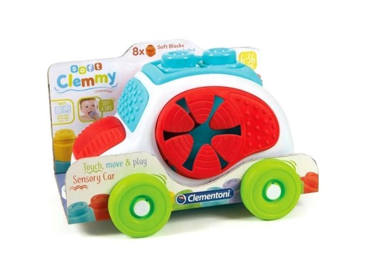 Innowacyjne autko z miękkimi elementami, takimi jak klocki Clemmy, zapewniające stymulujące doświadczenie, będące połączeniem świetnej zabawy i sensorycznych odkryć. Miękkie elementy można badać i dotykać, aby odkrywać różne wzory i kształty. Pobudza zmysł dotyku i umiejętności manualne. Dach autka może służyć jako podstawa do wieży z klocków Clemmy. Po podniesieniu dachu autko można wykorzystać jako praktyczny schowek na klocki. Dodatkową zabawę zapewniają miękkie boczne okna autka, przez które można wkładać i wyjmować klocki Clemmy. Autko i klocki nadają się do mycia, nawet w zmywarce.