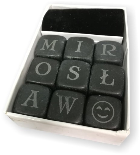 - Znakowanie: w cenie znakowanie po jednej stronie każdej kostki. Na tej aukcji kupujesz produkt z RÓŻNYM DOWOLNYM grawerem na każdej kostce INDYWIDUALNIE.