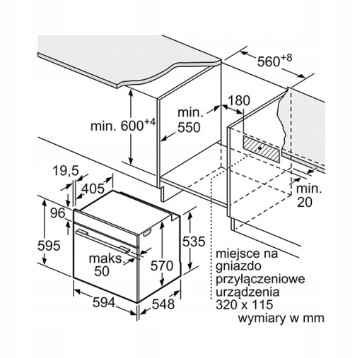 - Wymiary niszy (WxSxG): 585 mm - 595 mm x 560 mm - 568 mm x 550 mm