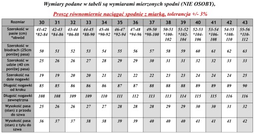 - Spodnie po przymierzeniu powinny być raczej "na ciasno" gdyż nowe spodnie mają tendencję do rozbijania (rozciągania) się po chwili używania o pół nawet do jednego rozmiaru.