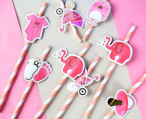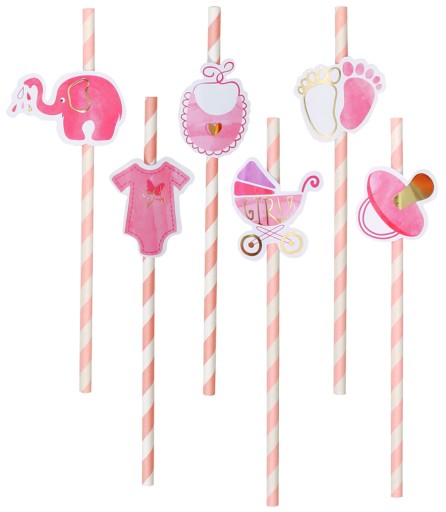 SŁOMKI PAPIEROWE W KOLORZE JASNEGO RÓŻU Z PAPIEROWĄ DEKORACJĄ Z MOTYWEM BABY SHOWER.