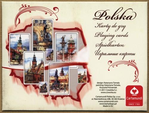Talia kart do brydża dostępna jest w dwóch kolorach czerwonym i srebrnym. Na awersach widnieją najpiękniejsze zabytki oraz miejsca, które warto zobaczyć w Polsce malowane akwarelą.(55 kart do gry).Mix kolorów.
