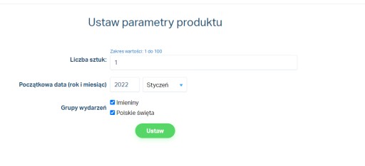 1. Po wejściu w link, ustaw parametry takie jak liczba sztuk, początkowa data w kalendarzu, dodatkowe wydarzenia. Wybierz szablon spośród wielu dostępnych i zacznij tworzenie kalendarza.