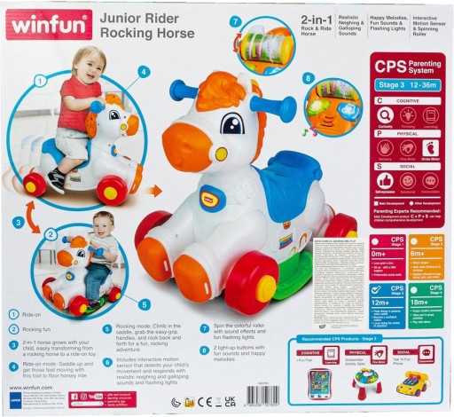 Zabawka w przyjemnej i zachęcającej do zabawy kolorystyce, wykonana z materiałów dobrej jakości. Posiada wymagane certyfikaty. Konik zostanie wspaniałym towarzyszem zabaw i przyjacielem na dłużej.