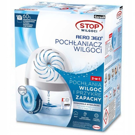 Metylan Stop Wilgoci AERO pochłaniacz wilgoci 450g z wymiennymi tabletkami AERO 360° redukuje nadmiar wilgoci w pomieszczeniach do momentu, aż wilgotność powietrza osiągnie optymalny poziom.