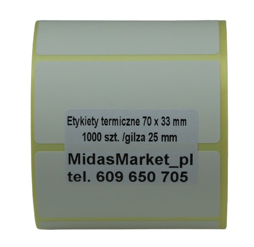 MARKOWE etykiety termiczne "MidasMarket_pl", białe 70mm (szerokość) x 33mm (długość) z GWARANTOWANĄ ilością 1000 szt. na rolce do drukarek etykiet / kodów kreskowych.