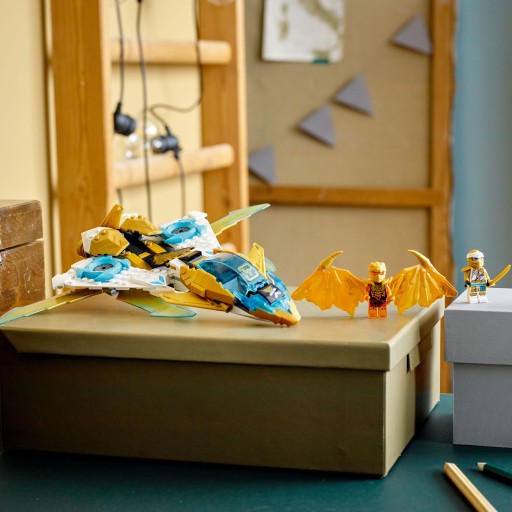 Ten zestaw konstrukcyjny ninja zawiera trzy minifigurki: złotego smoczego Cole’a z kolczastymi skrzydłami złotego smoka, a także złotego Zane’a i generała Vangelisa do odgrywania porywających walk dobra ze złem w mieście NINJAGO.