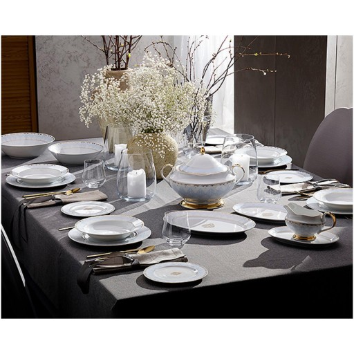 Zastawa o kultowym fasonie, z dodatkami złota i błękitu przywołuje na myśl królewskie przyjęcia, owiane nonszalancką tajemnicą historii. Opływowy kształt i delikatne zdobienia magnetyzują wytworną elegancją.