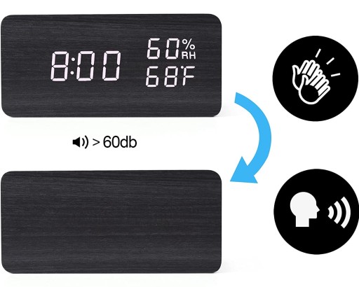 Gdy jest cisza wyświetlacz przechodzi w stan uśpienia i nie wyświetla godziny. Wystarczy klaśnięcie, lub puknięcie w obudowę i w zegarku włącza się wyświetlacz na 10 sekund