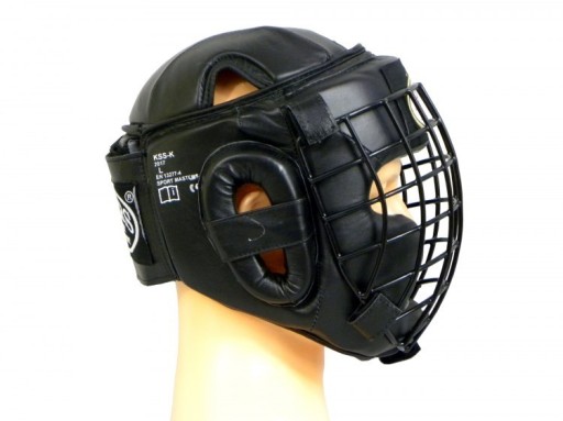 Kask sparingowy z kratką KSS-K wykonany z wysokiej jakości skóry bydlęcej. W pełni zabudowany z ochroną kości policzkowych, brody i górnej cześci głowy. Odpinana kratka z metalu wyposażona w duże otwory wokół oczu, nie ograniczające widoczności