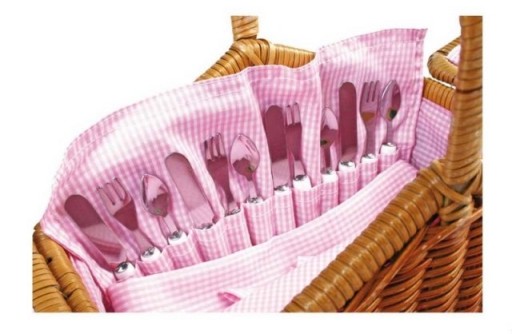 Kosz piknikowy został wykonany z lakierowanej wikliny oraz wyściełany materiałem w biało-różową kratkę. Posiada wygodną rączkę i zapięcie na paski z rzepami. W środku znajduje się zestaw porcelanowych naczyń i sztućców dla czterech osób i inne akcesoria: