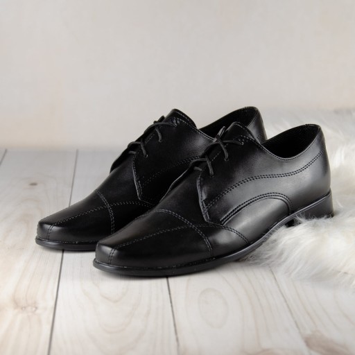 Klasyczne, czarne buty komunijne dla chłopca. Buciki dobrze wyprofilowane, dzięki czemu są bardzo wygodne. Zewnątrz obuwie wykonane z miękkiej skórki ekologicznej, natomiast wkładka ze skóry naturalnej. Uniwersalne buty, które będą pasować zarówno do eleganckiego garnituru komunijnego, jak i do klasycznej alby lub komży.